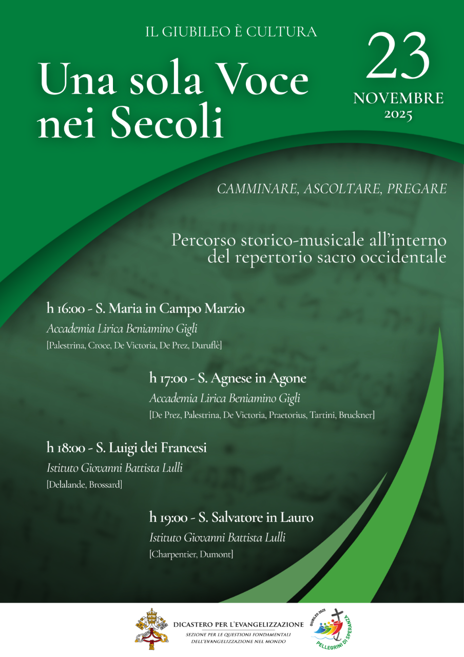In occasione del Giubileo dei Cori e delle Corali, previsto per le giornate del 22 e 23 novembre 2025, il Dicastero per l’Evangelizzazione ha organizzato un concerto, sulla scia dei concerti giubilari «Armonie di speranza», dal titolo «Una sola voce nei secoli». Questa iniziativa, che si sviluppa nel contesto della rassegna culturale «Il Giubileo è cultura», si costituisce di un percorso liturgico-musicale che presenta, in forma di pellegrinaggio artistico, la ricchezza e la pluralità delle forme corali nate all’interno della tradizione sacra occidentale.