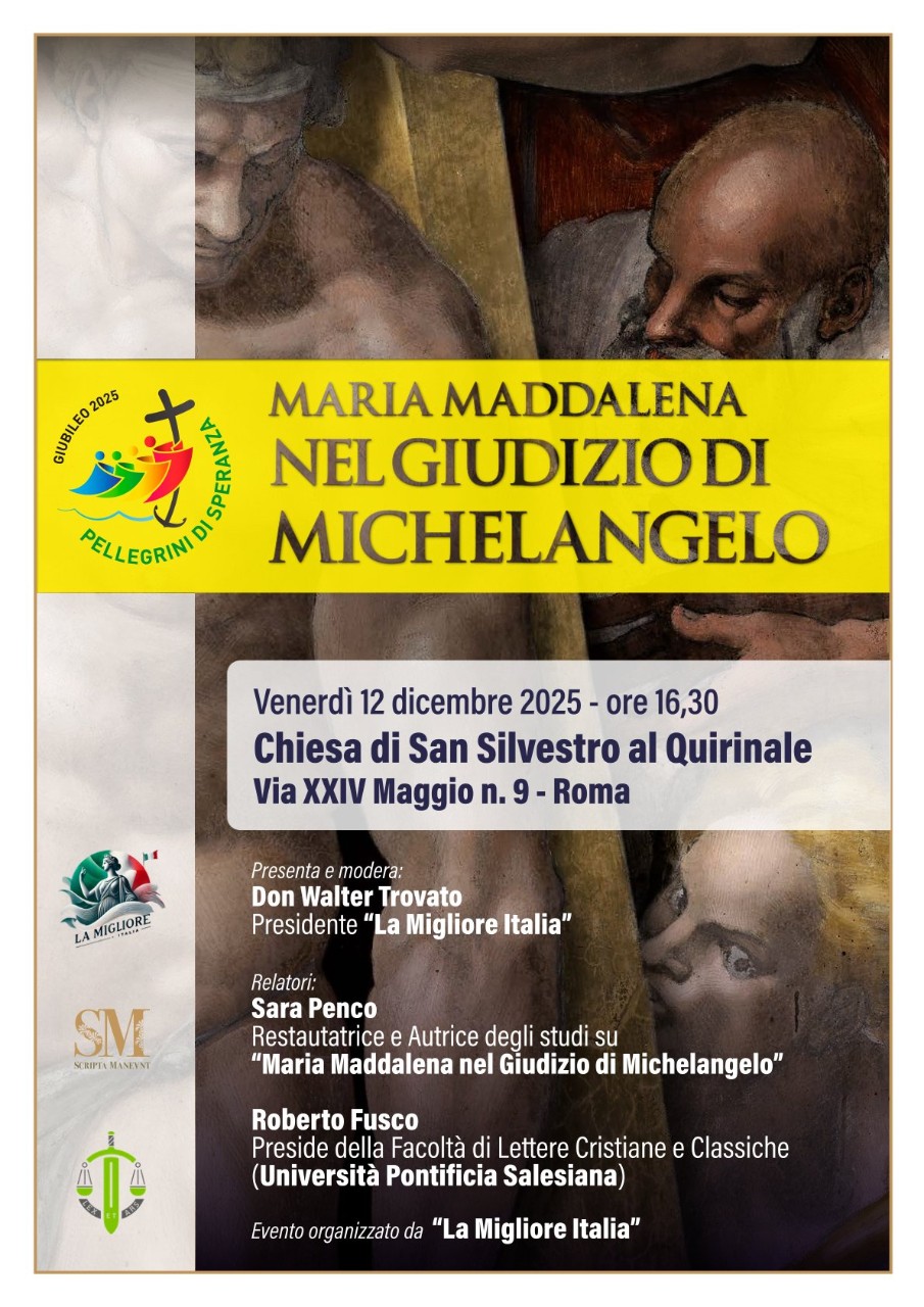 A chiusura dell’anno giubilare, nell’atmosfera del Santo Natale, “La Migliore Italia” organizza, nella Chiesa barocca di San Silvestro al Quirinale, un tavola rotonda per spiegare e motivare l’identificazione di Maria Maddalena nel Giudizio di Michelangelo. La presenza della Santa nell’affresco assume un significato spirituale di straordinaria importanza, perché ribadisce il messaggio di speranza implicito nel racconto biblico nel quale è contenuta la promessa che il giudizio di Dio su ogni colpa sarà un giudizio di grazia.